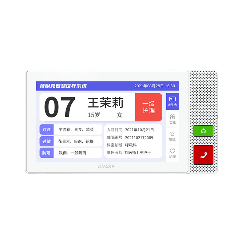 安裝在病床頭的交互設(shè)備機(jī),代替?zhèn)鹘y(tǒng)紙質(zhì)卡。產(chǎn)品支持呼叫對講、為住院患者提供病例查詢、狀態(tài)自動提醒等護(hù)理需求等。