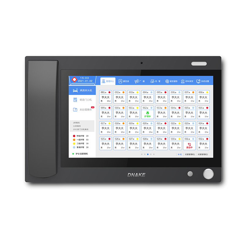 設(shè)置在護士站,可壁掛也可直接放在桌面上。主要接聽病區(qū)內(nèi)病床分機的呼叫以及患者信息查詢、廣播等基礎(chǔ)應(yīng)用功能,減輕醫(yī)護人員來回跑動的無效勞動和壓力,及時響應(yīng)患者需求,并做好醫(yī)護信息管理。