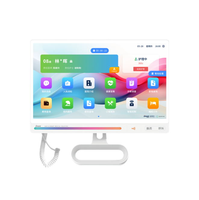 1)采用多點(diǎn)觸控電容觸摸屏,超薄面板,含手持呼叫手柄,安裝在病床上方的多功能擺臂上,每個(gè)病床一臺(tái),用于呼叫護(hù)士站,患者基本信息展示。